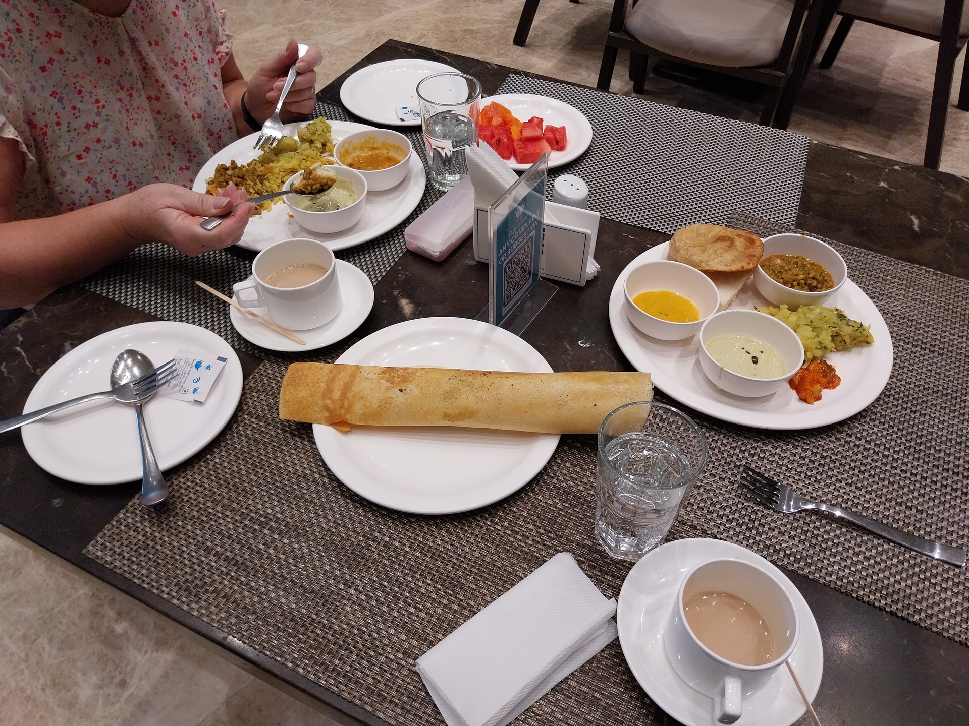 Nach der Rückkehr und dem Duschen reichte die Zeit meist noch, die über den vergangenen Tag angefallenen wenigen Sachen zu waschen und aufzuhängen. Auf dem Balkon sind die spätestens am Nachmittag wieder trocken. Um 8:30 Uhr werden frische Brötchen geliefert und es wartete bereits das Frühstück im von unserem Gastgeber betriebene bescheidenen Restaurant auf uns. Meist ist es das köstliche Bhaji. Manchmal auch Idlis und/oder Samosas mit würzigem Sambar.