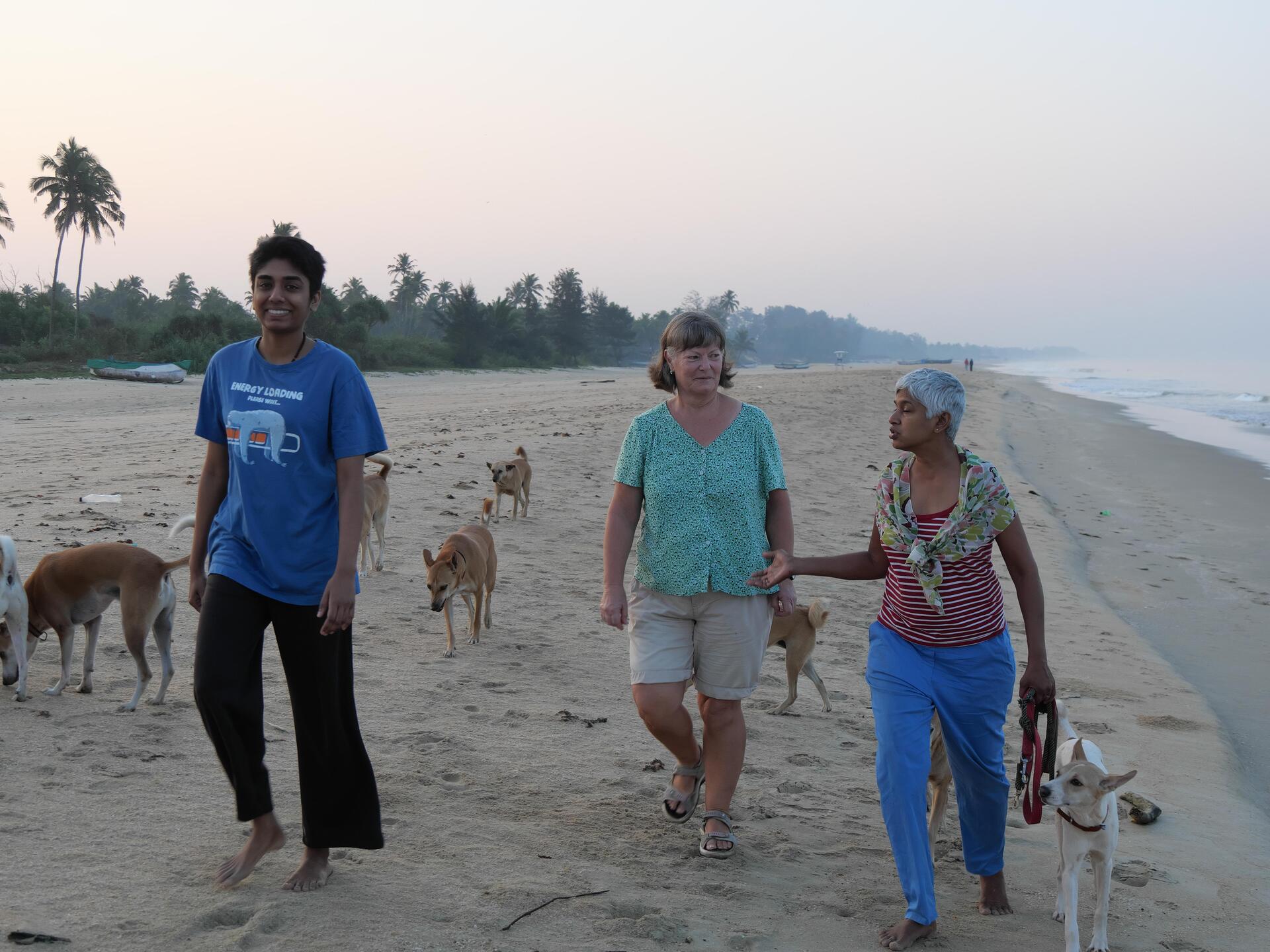 Eines Tages machten wir sie auf einen jungen Hund aufmerksam, der hinkte; er war möglicherweise angefahren worden. Sofort nahmen sie ihn in ihrem Auto mit, ließen ihn operieren und pflegten ihn in ihrem Zuhause, bis er nach etwa eineinhalb Monaten wieder in seine Gruppe zurückkonnte. Nach dieser Erfahrung freuten wir uns jeweils, die beiden, Rahana und Jackie, morgens zu treffen. Wenn sie zum Morning Walk am Strand mit den Hunden aufbrachen, gingen wir ins Wasser. Meist trafen wir uns wieder, wenn wir aus dem Wasser kamen und sie zurückkehrten und die Hunde fütterten. Dabei lernten wir nicht nur zwei Töchter von Rahana kennen, sondern auch Marga. Marga lebt in der Schweiz am Genfersee. Als „Ambassador for International Relations at ‚César Ritz Colleges‘“ hat Marga auf der ganzen Welt Kontakt zu einer Vielzahl ehemaliger Studenten, die inzwischen im Management der besten Hotels sind. So ist sie befreundet mit dem Direktor des V. M. Sagaocar Institute of International Hospitality Education in der Nähe von Margao, Herrn Prof. Irfan Mirza. In dem von ihm geführten Universitätskomplex wohnte sie während ihres Aufenthalts in Goa. Rahana ist die Frau von Prof. Mirza, Jackie die Frau des deutschen Leiters der kulinarischen Abteilung.